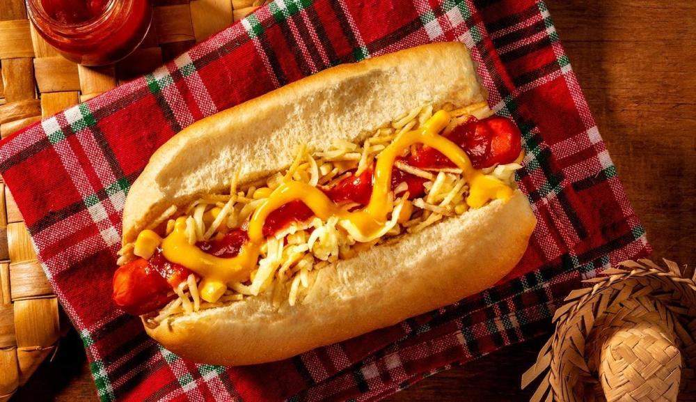 Pão, purê, salsicha de porco, queijo, catupiry, cheddar, calabresa fatiada, milho, ervilha, azeitona, maionese, ketchup, batata palha, ovo de codorna e vinagrete.