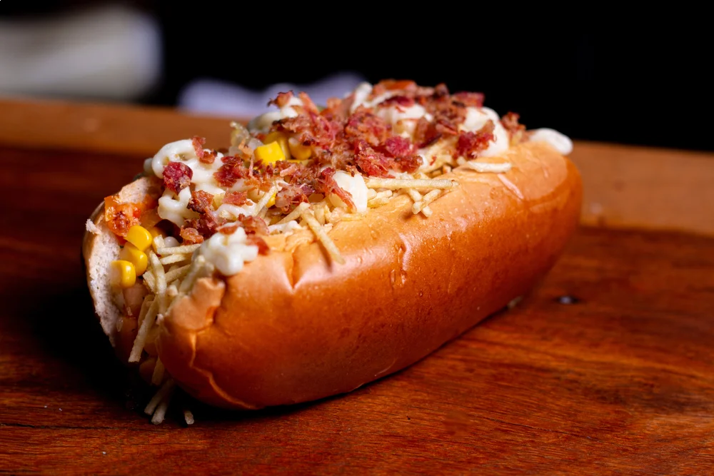 Pao, purê, cupim, salsicha, queijo, catupiry, cheddar, salame, calabresa fatiada, milho, ervilha, azeitona, ketchup, maionese, batata palha, ovo de codorna e vinagrete.